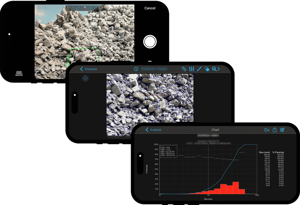 Capture a photo with your mobile device or import images from your drone or camera to calculate accurate size distributions in seconds.